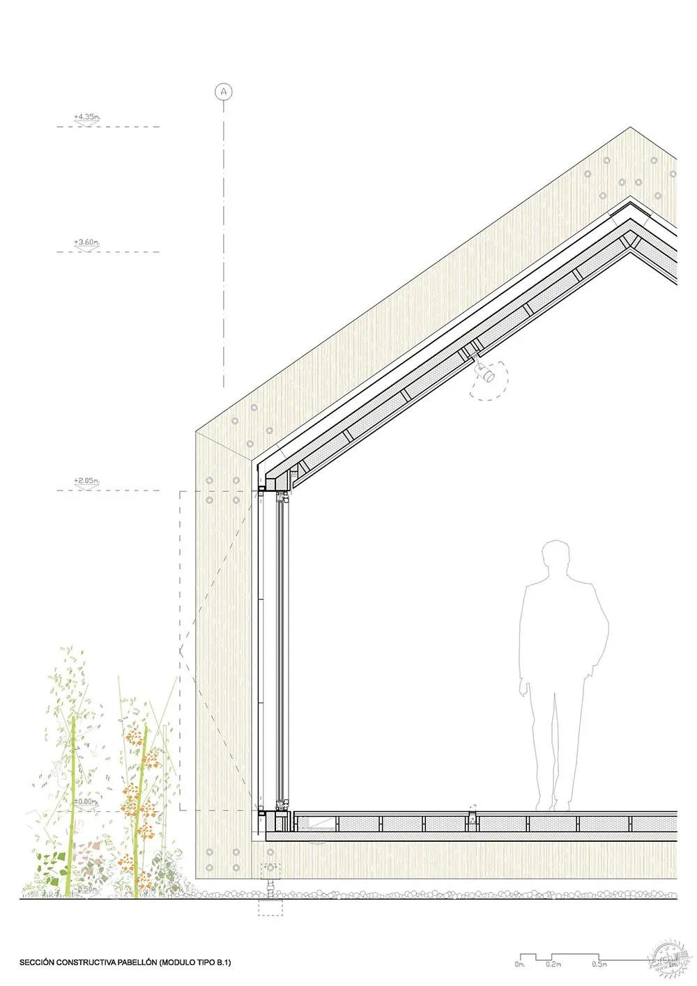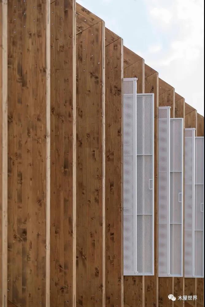 這是一個干燥的工業化木結構,能夠保證質量,對于環境的影響低,但是有著一定的效率、經濟效益,以及結構設計精準度。與此同時,這種體系便于運輸、調試、裝卸,為了滿足這些需求,結構、天花板、立面、技術樓層的綜合網絡和空調之間的協調必不可少。在建筑內部,項目的最后一層覆蓋了與展館中建筑部分相同的完成面。