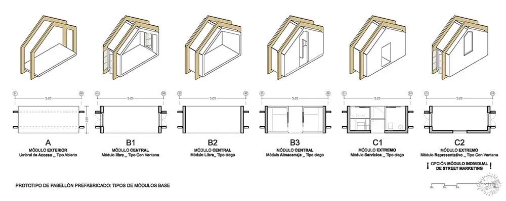 這是一個靈活重配置的工業體系。預制展館原型基于標準模塊的多種形式,是靈活多變的體系。這種模塊化附加類型項目可以根據不同的項目需求進行配置,其中包括大型博物館大廳和小規模辦公室等多種組合。