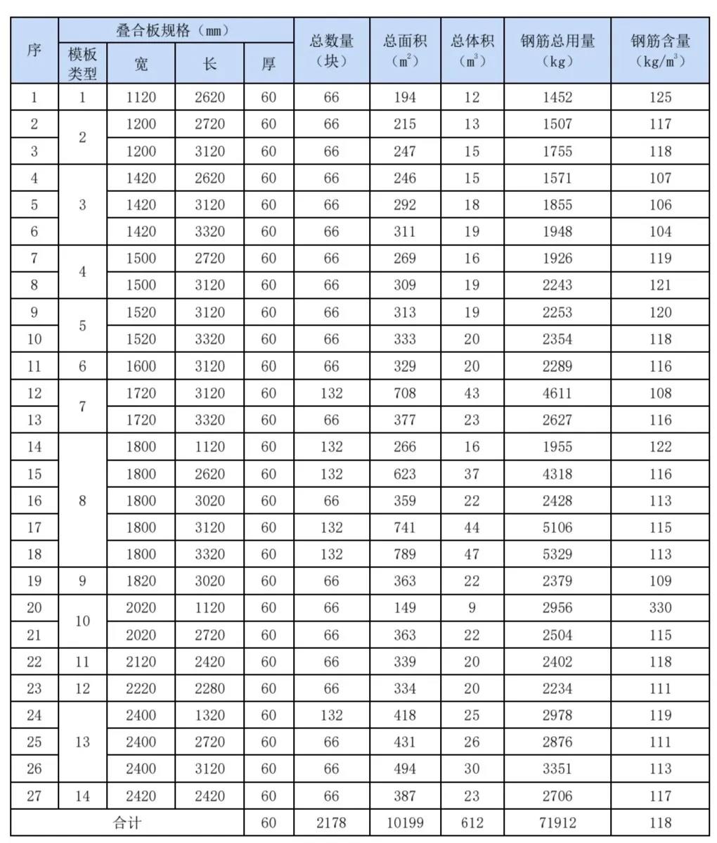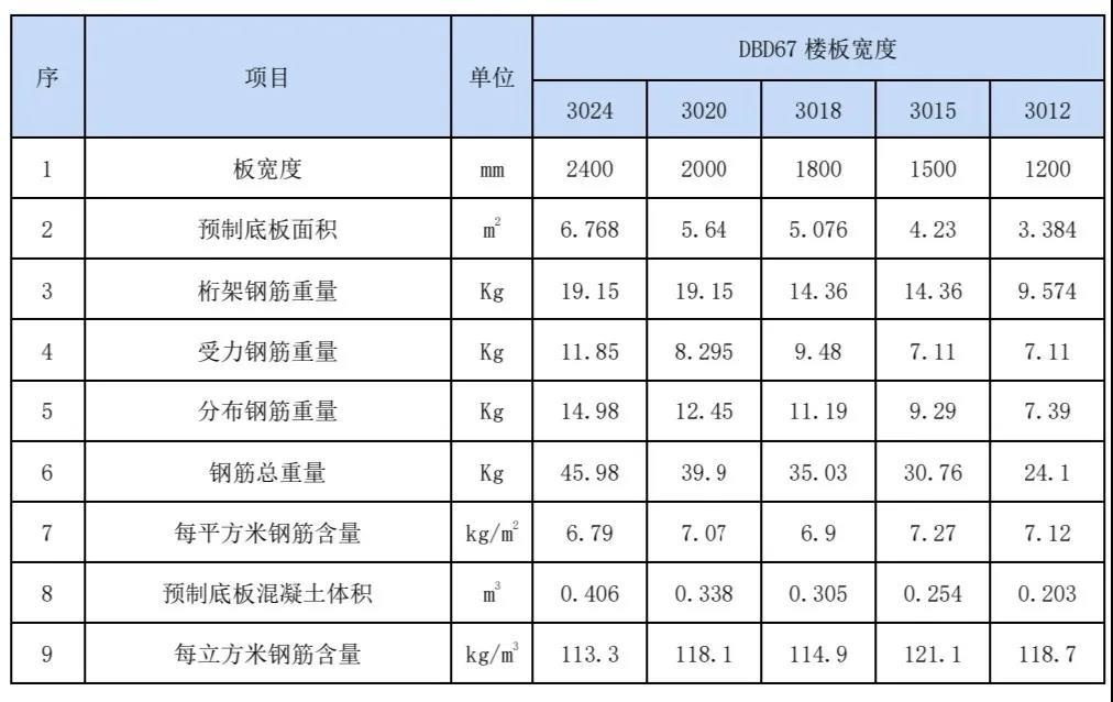 不同寬度預(yù)制底板的鋼筋含量計算明細如下表所示: